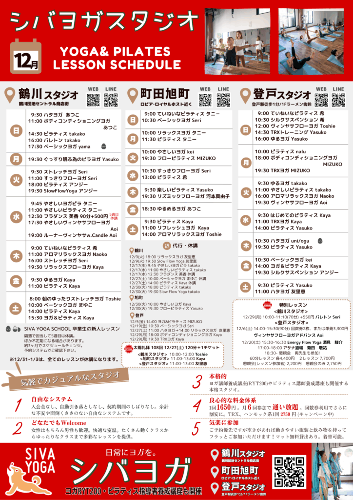 12/27㈯ 11:00 ハタヨガ → 14:00 リラックスヨガ ※時間、レッスン内容変更